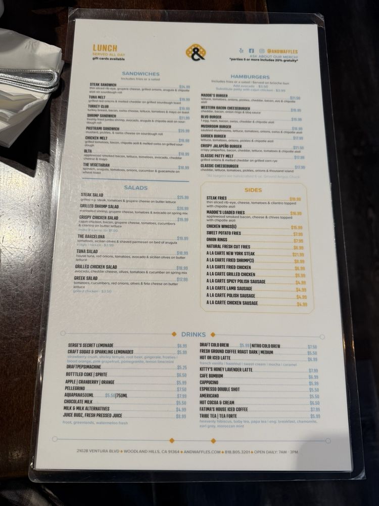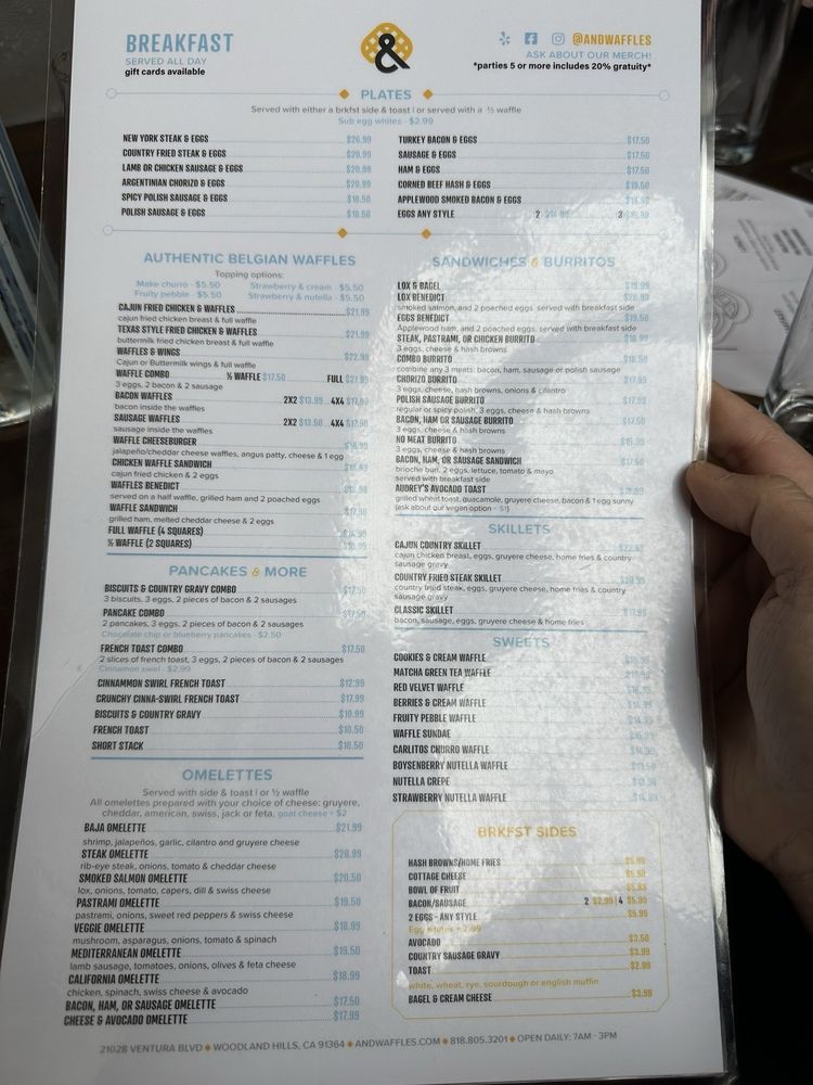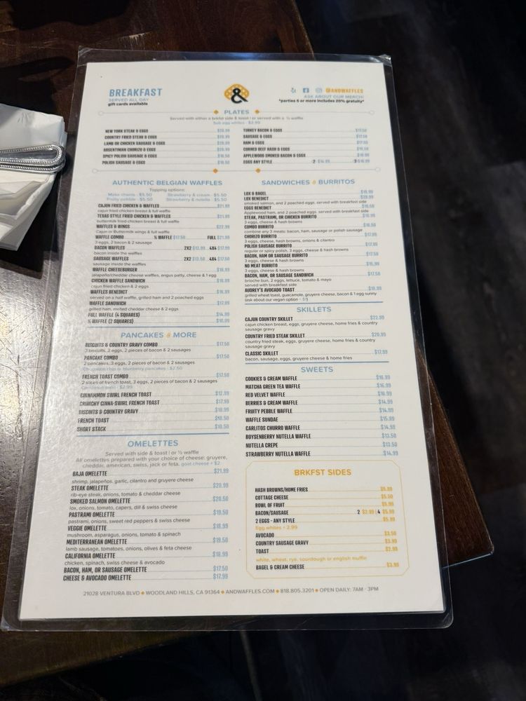 Welcome to & Waffles - Woodland Hills, the ultimate destination for breakfast and brunch lovers. Nestled at 21028 Ventura Blvd, this trendy spot offers a diverse menu that highlights not just their famous waffles, but also a range of delicious burgers and comforting sides. Vegetarian diners will rejoice in the numerous options available, ensuring everyone finds something to savor.